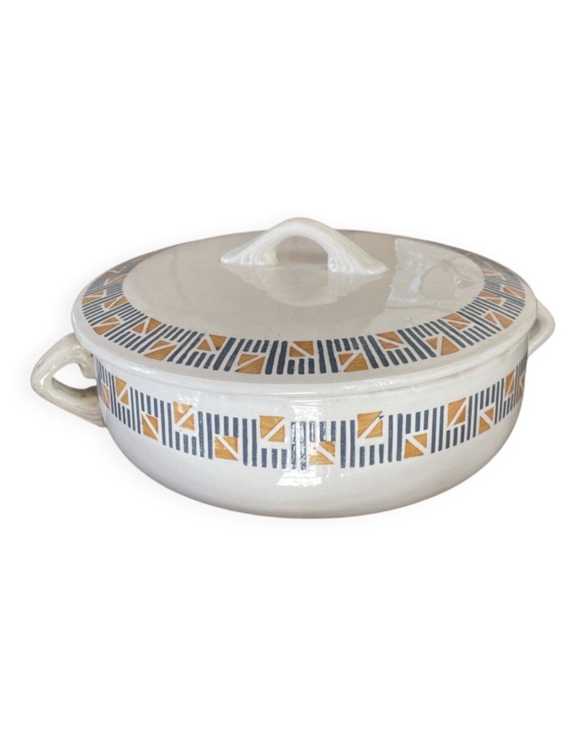 Élégante soupière ancienne au décor géométrique typique du style Art déco, modèle “Dolly”, datant des années 1920 à 1940.