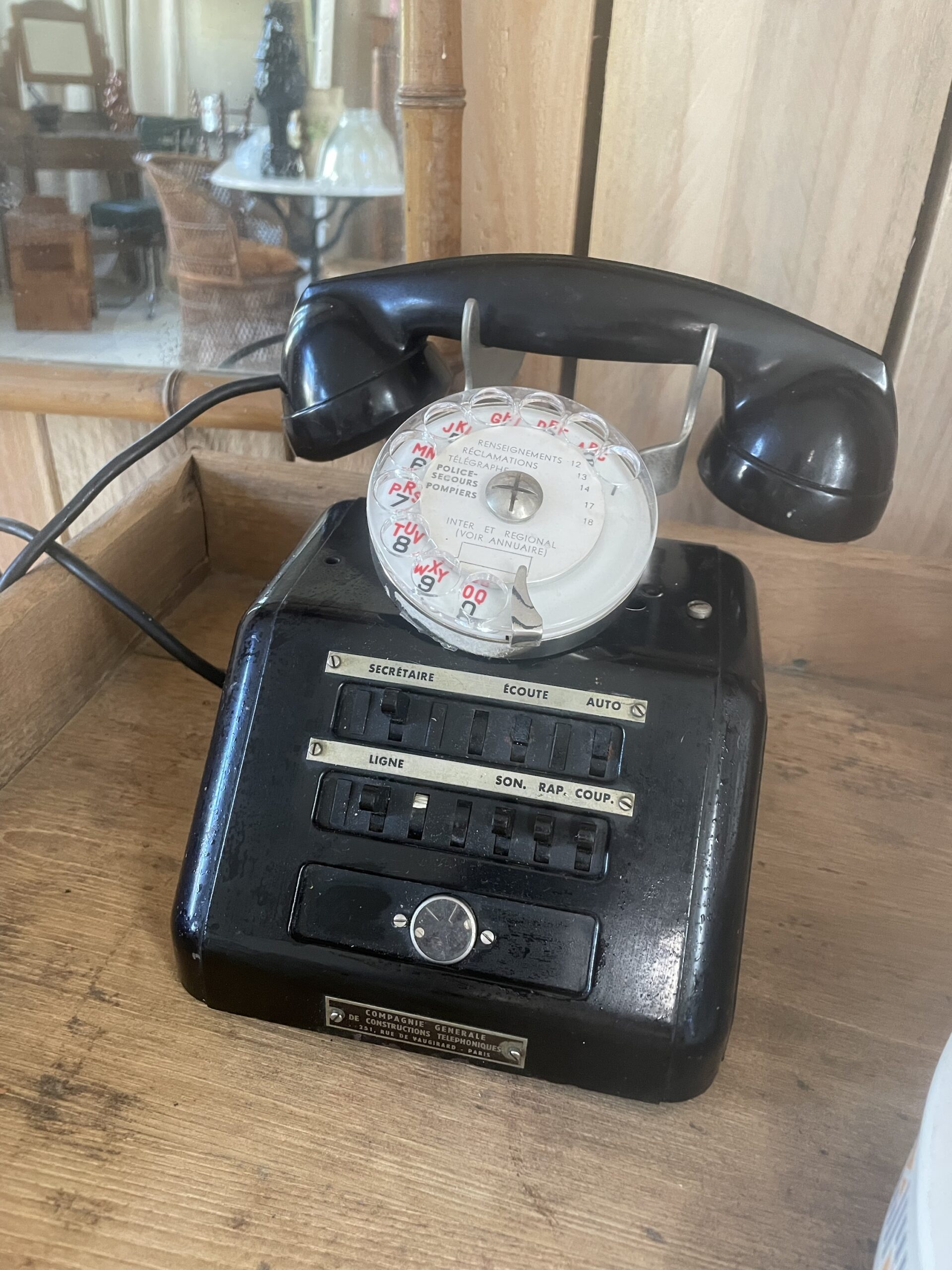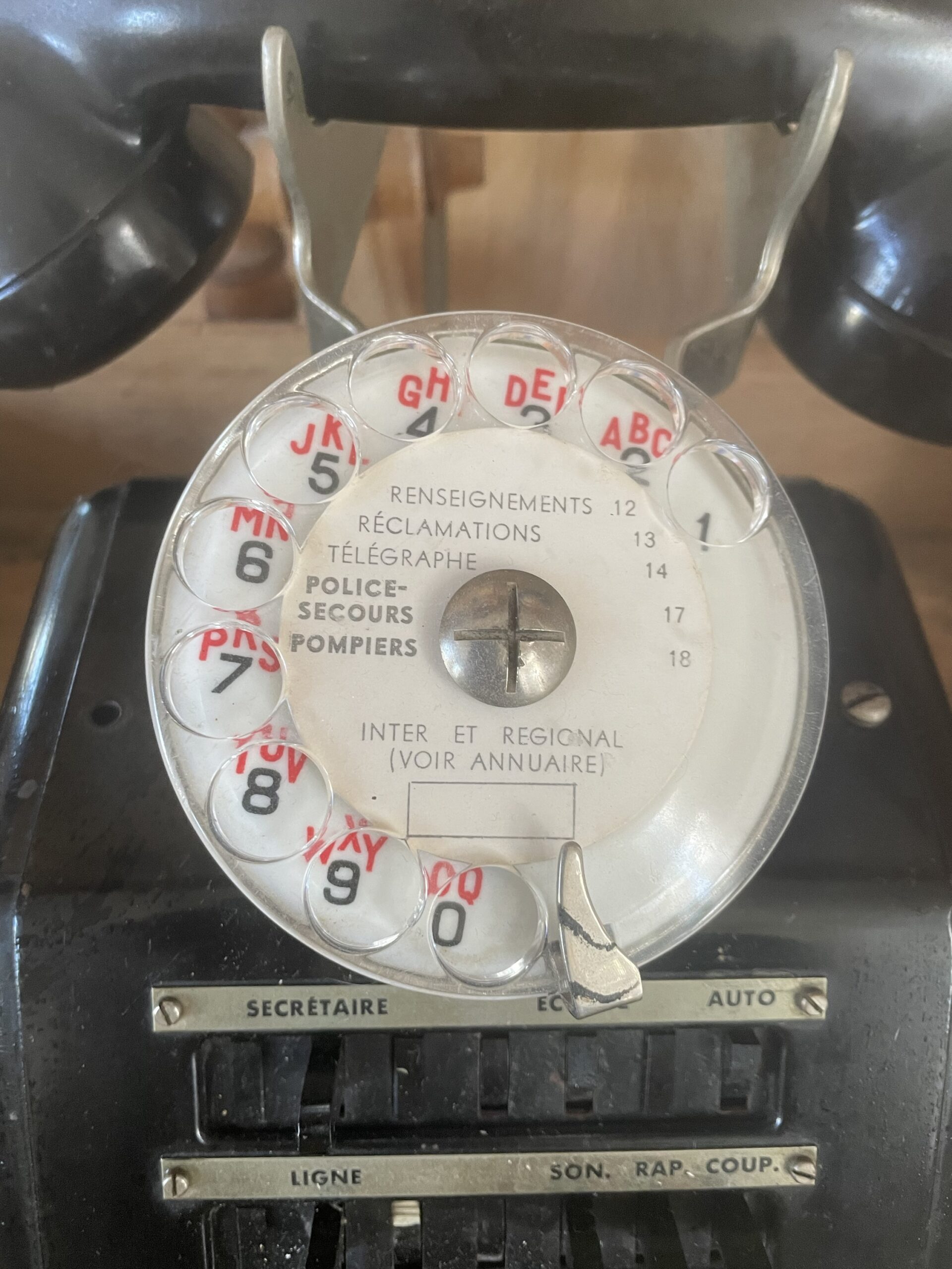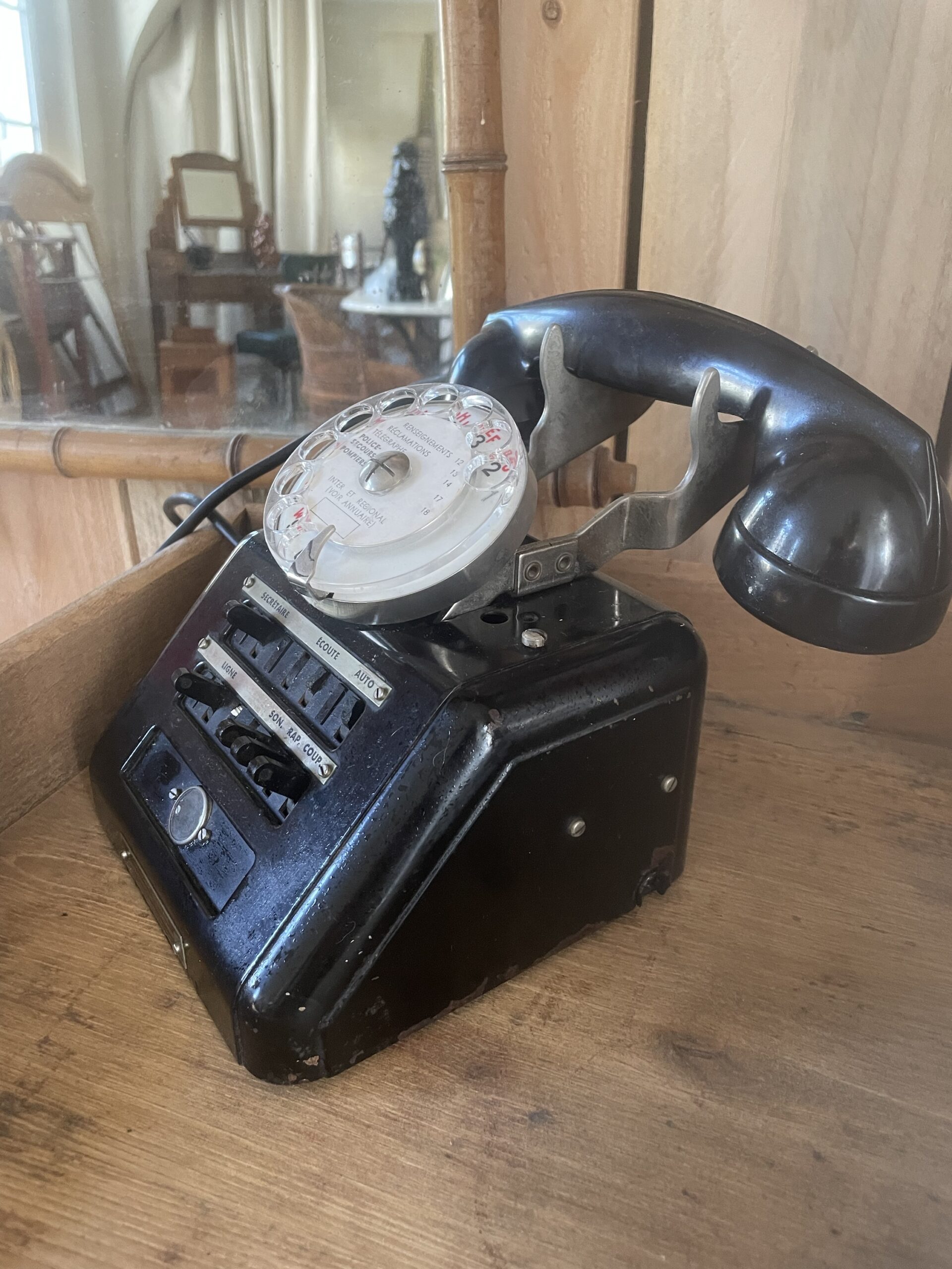 Authentique téléphone vintage en bakélite noire, avec cadran rotatif protégé par un clapet et écouteur suspendu.