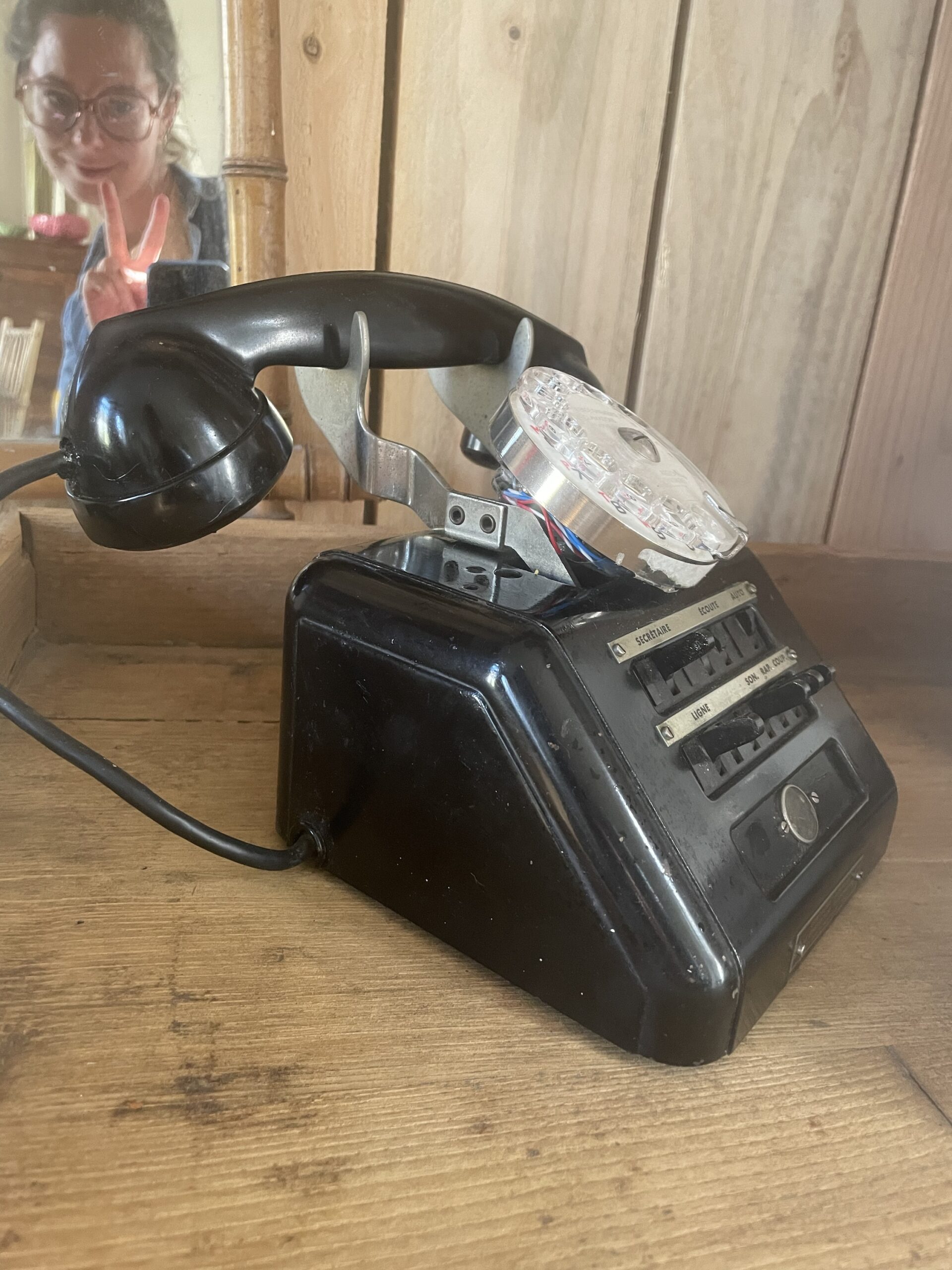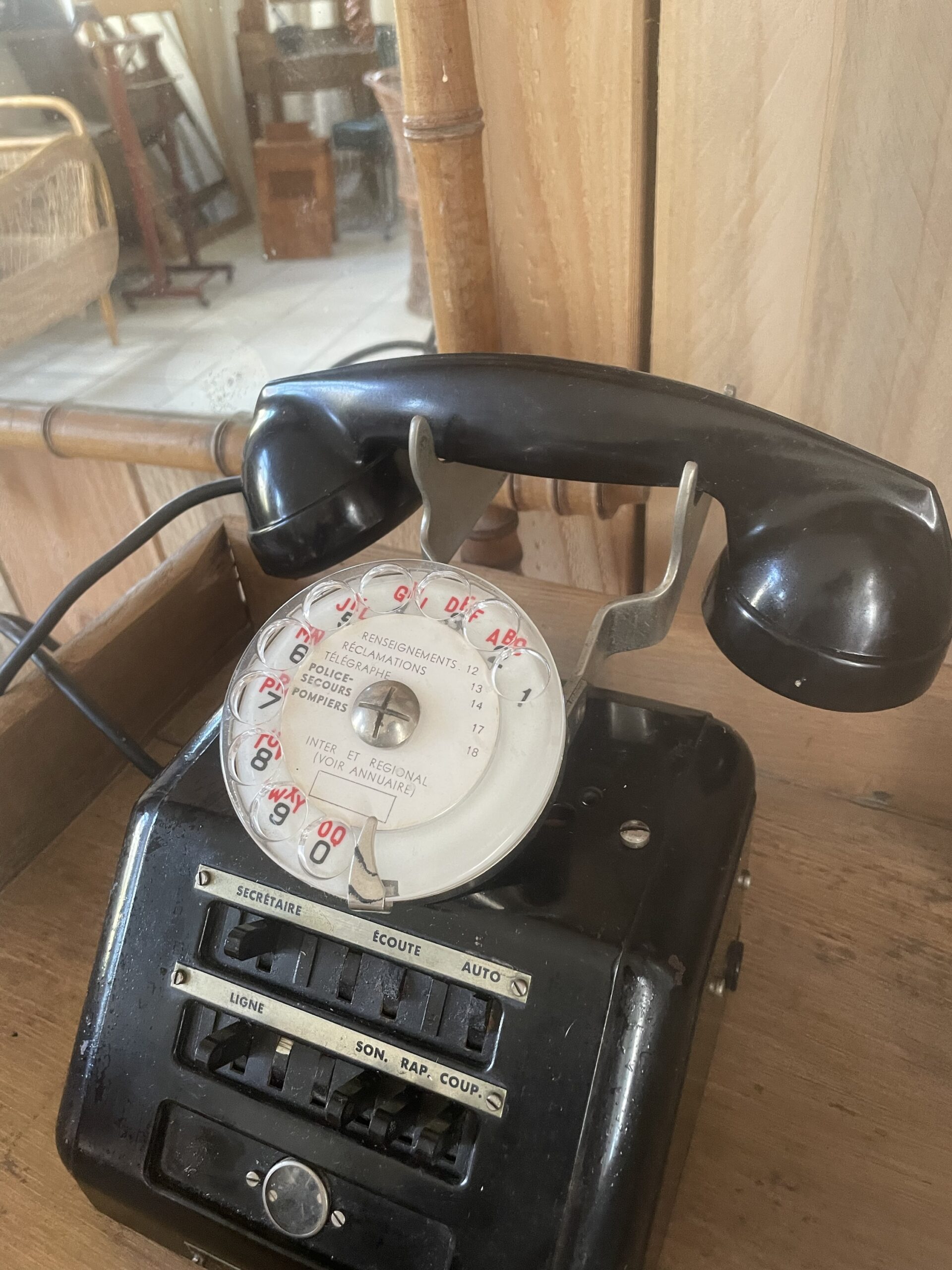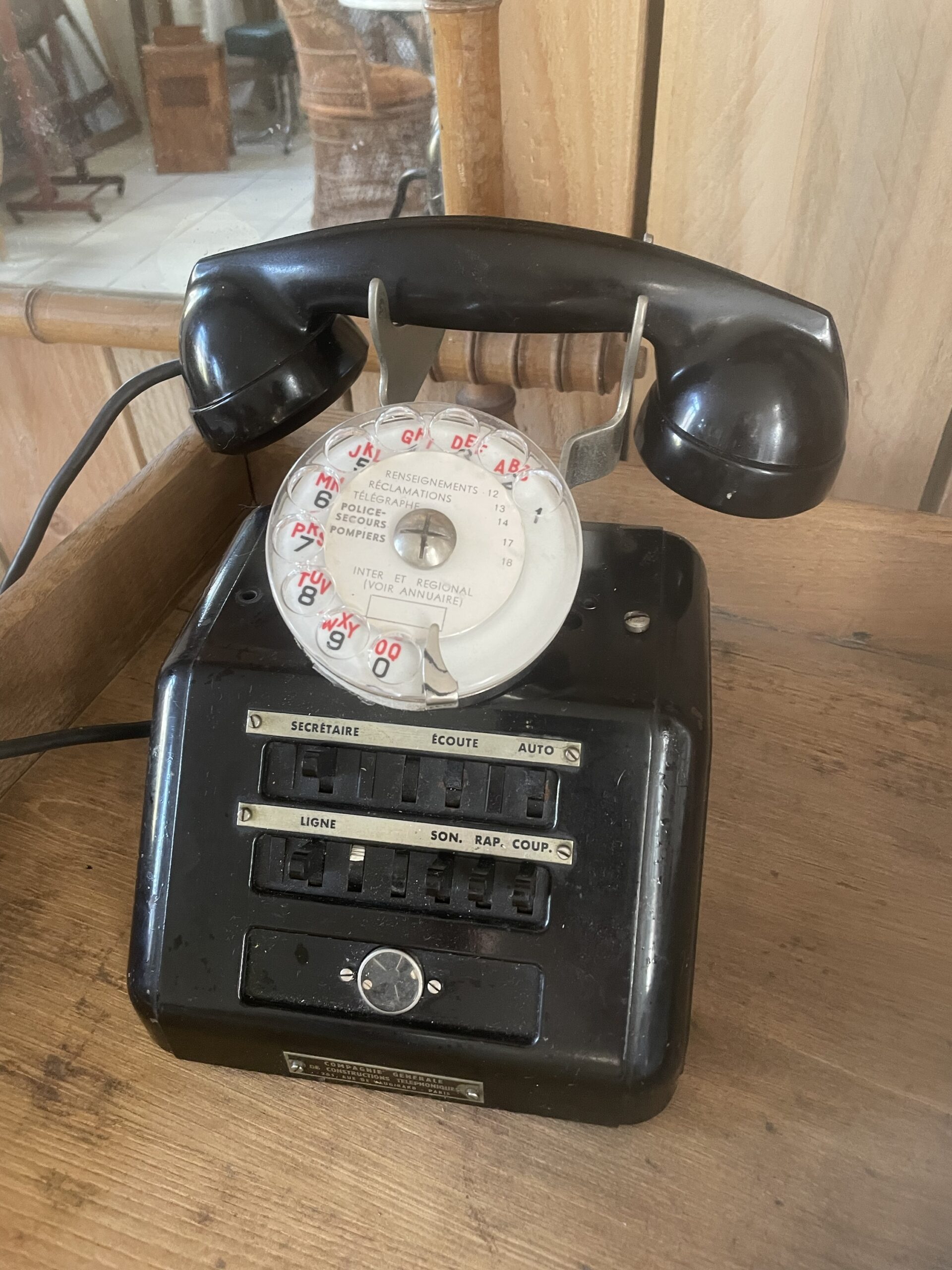Authentique téléphone vintage en bakélite noire, avec cadran rotatif protégé par un clapet et écouteur suspendu.