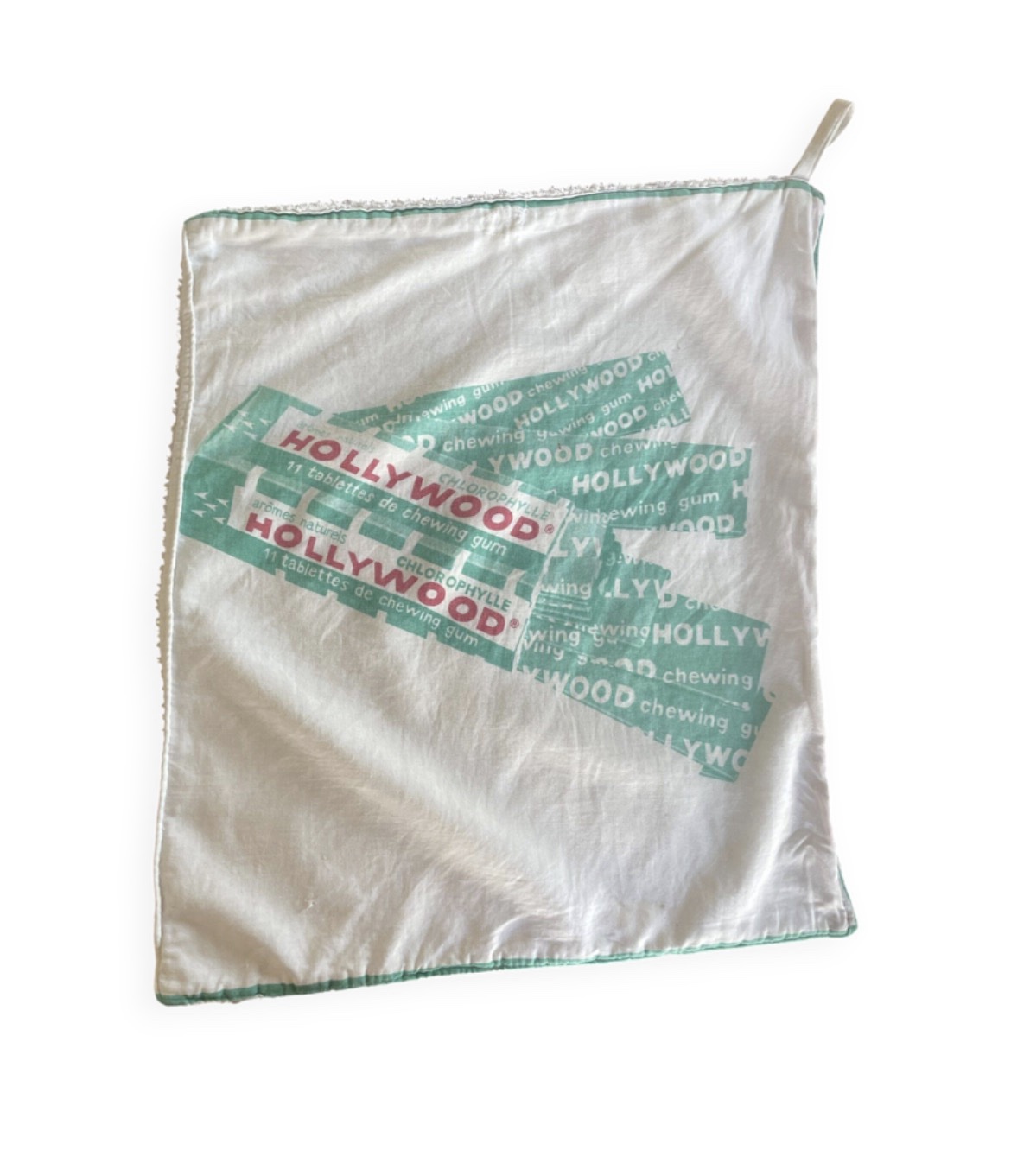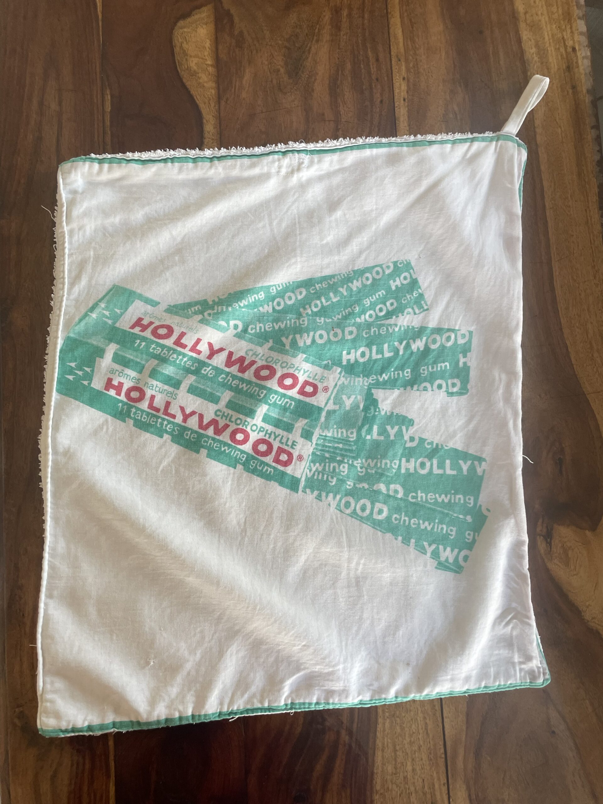 Charmant torchon vintage en éponge, au design publicitaire emblématique de la célèbre marque Hollywood Chewing-Gum. Son visuel vert d’eau et blanc, à la fois rétro et graphique, en fait une pièce idéale pour une décoration authentique ou une collection d’objets publicitaires anciens.